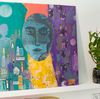 Original artwork using mixed media (paint, ink and collaged papers) on a thin (3mm to 10mm thick) wood particle board. It is sealed and protected by a coat of gloss acrylic medium. The surface is not flat, showing the relief of collage elements and paint strokes.